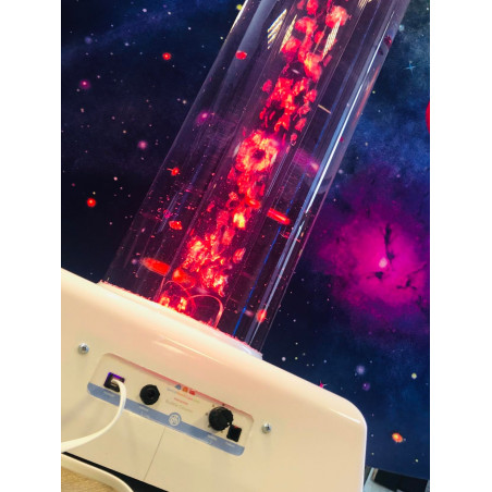 Całość tworzy hipnotyzujący taniec koralików/ kuleczek, które wystrzelone w górę delikatnie opadają w dół. W obudowie kolumny zamontowano potencjometr, którym sterujemy intensywność wydobywanych bąbelków. Barwy w urządzeniu zmieniają się automatycznie lub za pomocą kontrolerów przewodowych jak i bezprzewodowych, które można zakupić osobno.