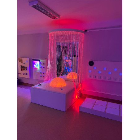 Baldachim można zamontować do sufitu jak i do ściany. Idealnie nadaje się do pomieszczeń, w których są podwieszane sufity. Urządzenie sterowane jest za pomocą pilota, który zmienia kolory zgodnie z zaprogramowaniem lub zatrzymuje daną barwę.